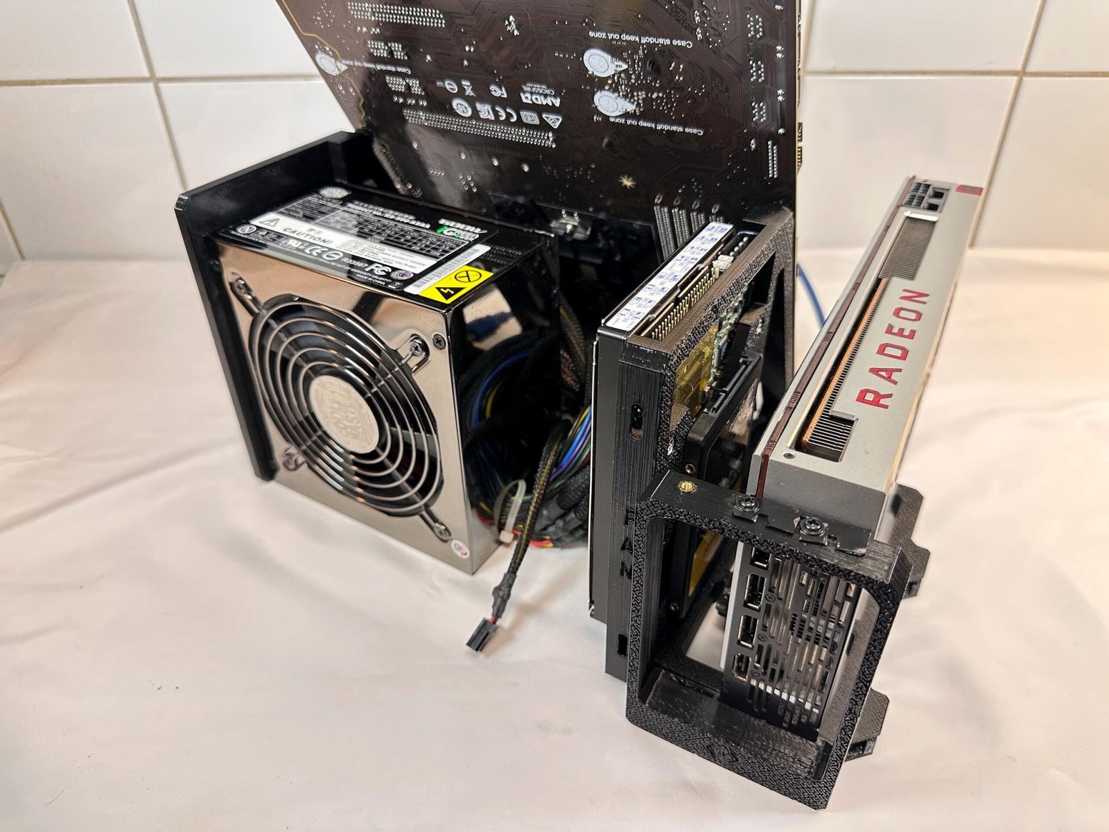 DOES NOT support a Mini ITX motherboard as the PSU WILL NOT fit behind in the assembly.